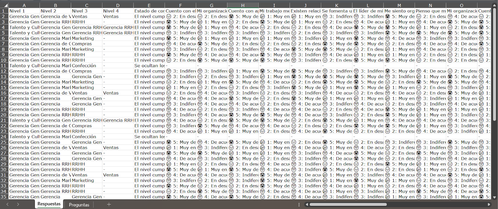 Esto generará un archivo Excel con dos hojas: la primera contiene los resultados individuales, indicando únicamente el área a la que pertenece cada participante junto a sus respuestas por pregunta; la segunda hoja incluye el listado completo de preguntas y sus respectivas opciones de respuesta.
