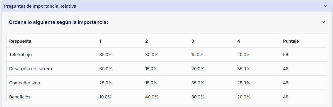 Si incluiste preguntas de importancia relativa también aparecerán sus resultados en esta pestaña para que puedas revisar las prioridades de tus colaboradores.