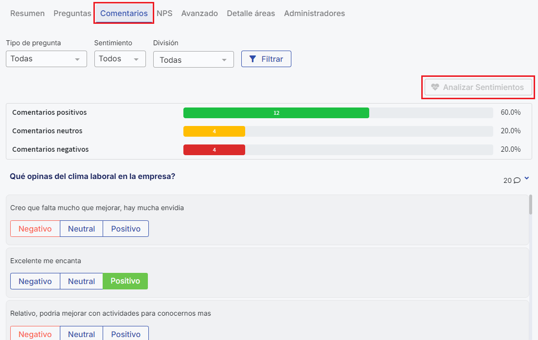 En esta pestaña puedes revisar los comentarios y respuestas de párrafo, información cualitativa que te permitirá entender mejor los resultados obtenidos. Podrás analizar los sentimientos de éstos de modo de identificar rápidamente el sentimiento asociado a cada uno de los comentarios. Esto puedes hacerlo haciendo clic en "Analizar Sentimientos" y el sistema a través de un mecanismo de inteligencia artificial te indicará mediante un gráfico la cantidad de comentarios asociados a un sentimiento positivo, neutro o negativo. En caso que necesites ajustar esta información puedes editar el sentimiento al cual fue asociado el comentario y guardar.