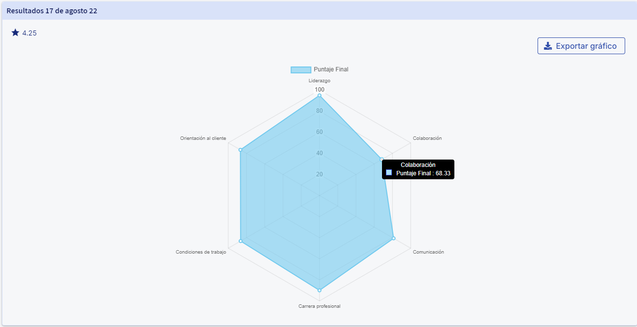 Además, en este gráfico encontrarás el Resultado General, convertido a una escala numérica de 1 a 5, ubicada en la esquina superior izquierda junto a la estrella.