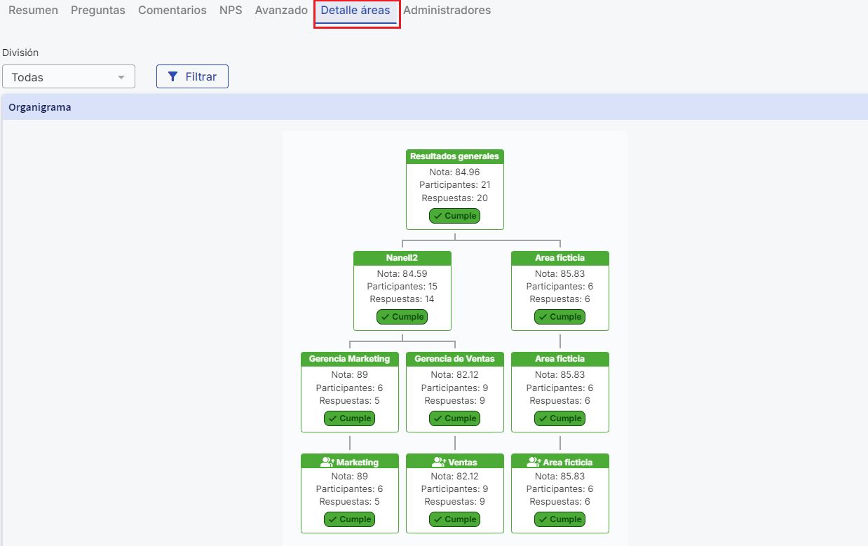Desde esta sección podrás revisar los resultados por nivel a través del organigrama. Si algún nivel no cumple con el criterio de visualización (al menos 4 respuestas por nivel), no podrás ver los resultados de dicho nivel, y este aparecerá resaltado en color rojo.