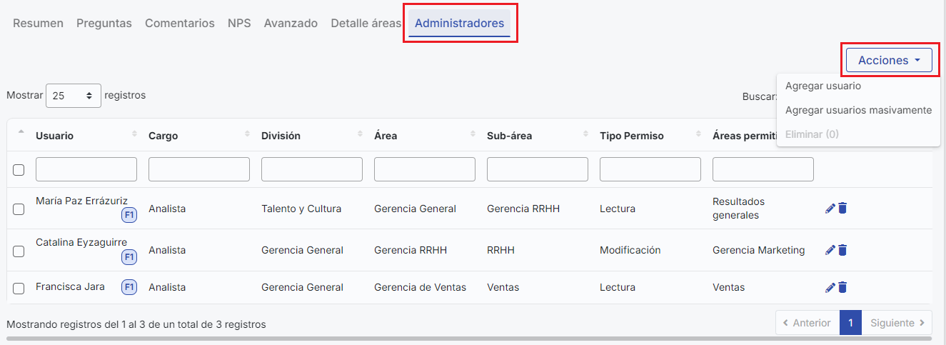 Por último, en la pestaña "Administradores" podrás compartir el proceso con otro usuario dentro de la plataforma. Esta función te permite compartir la reportería de la encuesta de clima con cualquier colaborador. Además, podrás seleccionar el tipo de permisos que tendrá el usuario y, si lo deseas, restringir la visualización a determinadas áreas específicas.