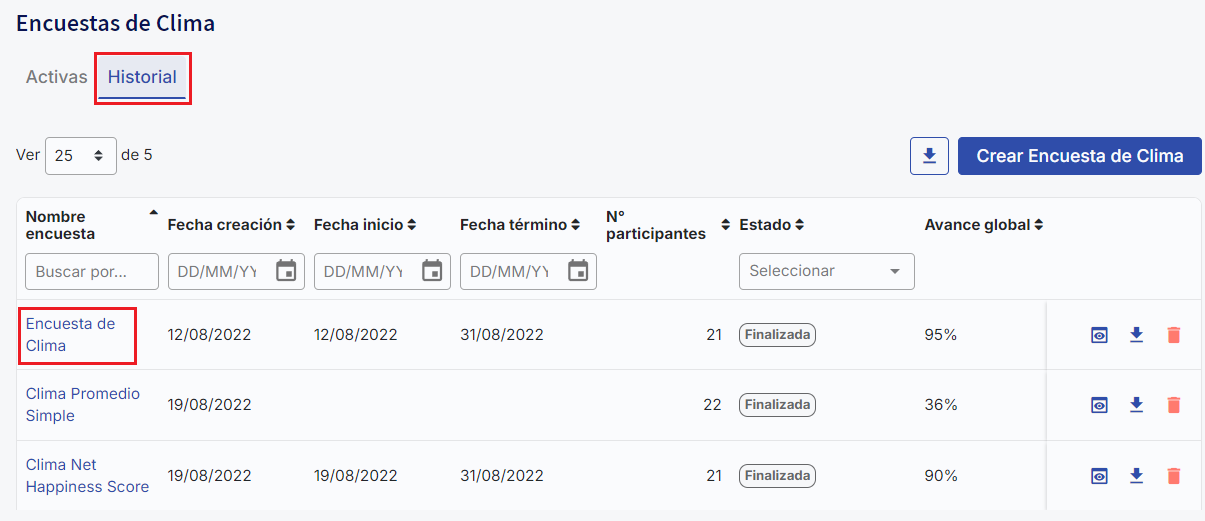 Al finalizar la encuesta, esta se moverá automáticamente a la sección "Historial", donde podrás revisar la reportería. Para hacerlo, simplemente haz clic en la encuesta que deseas consultar.