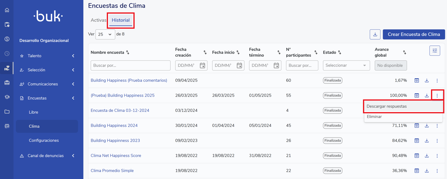 Para acceder a esta descarga, debes ir a la pestaña “Historial”, seleccionar la encuesta correspondiente y hacer clic en los tres puntos ubicados al costado derecho. Luego, selecciona la opción “Descargar respuestas”.