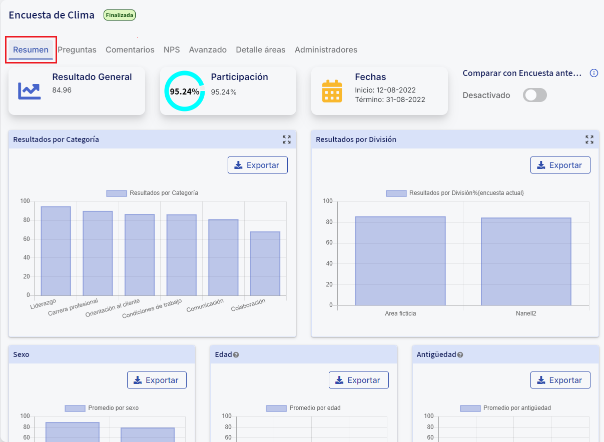 La pestaña resumen es el lugar donde puedes ver un panorama global de los resultados a partir de la siguiente información:
