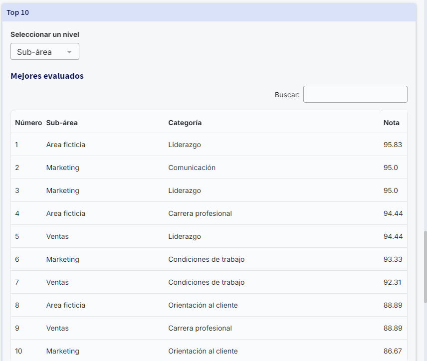 Consulta el listado de las 10 subáreas con las categorías mejor evaluadas y las 10 subáreas con las categorías peor evaluadas. Para obtener esta información, puedes aplicar los filtros y realizar comparaciones entre divisiones, áreas y subáreas.