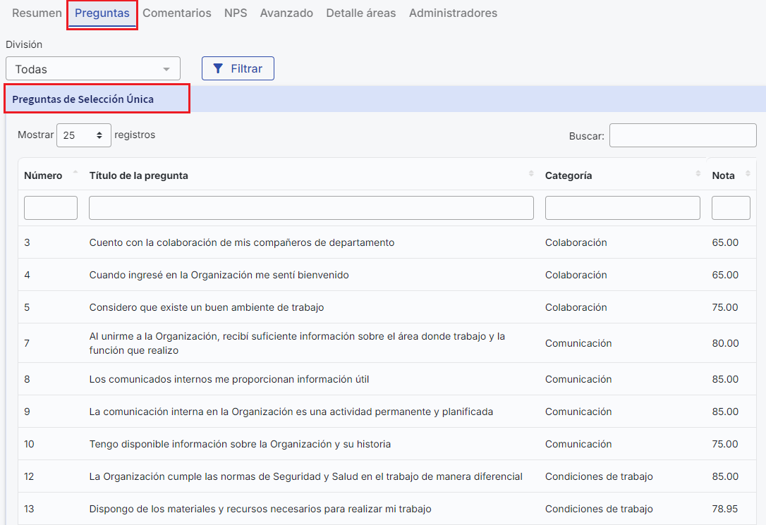 Y listo!, utilizar la reportería de la encuesta de clima te permitirá analizar los resultados de manera detallada y precisa, identificando tanto los aspectos positivos como las áreas de mejora dentro de tu organización. Asegúrate de explorar cada una de las pestañas disponibles para aprovechar al máximo las funcionalidades de la plataforma, desde la visualización de resultados generales hasta el análisis avanzado por categorías, áreas y niveles.