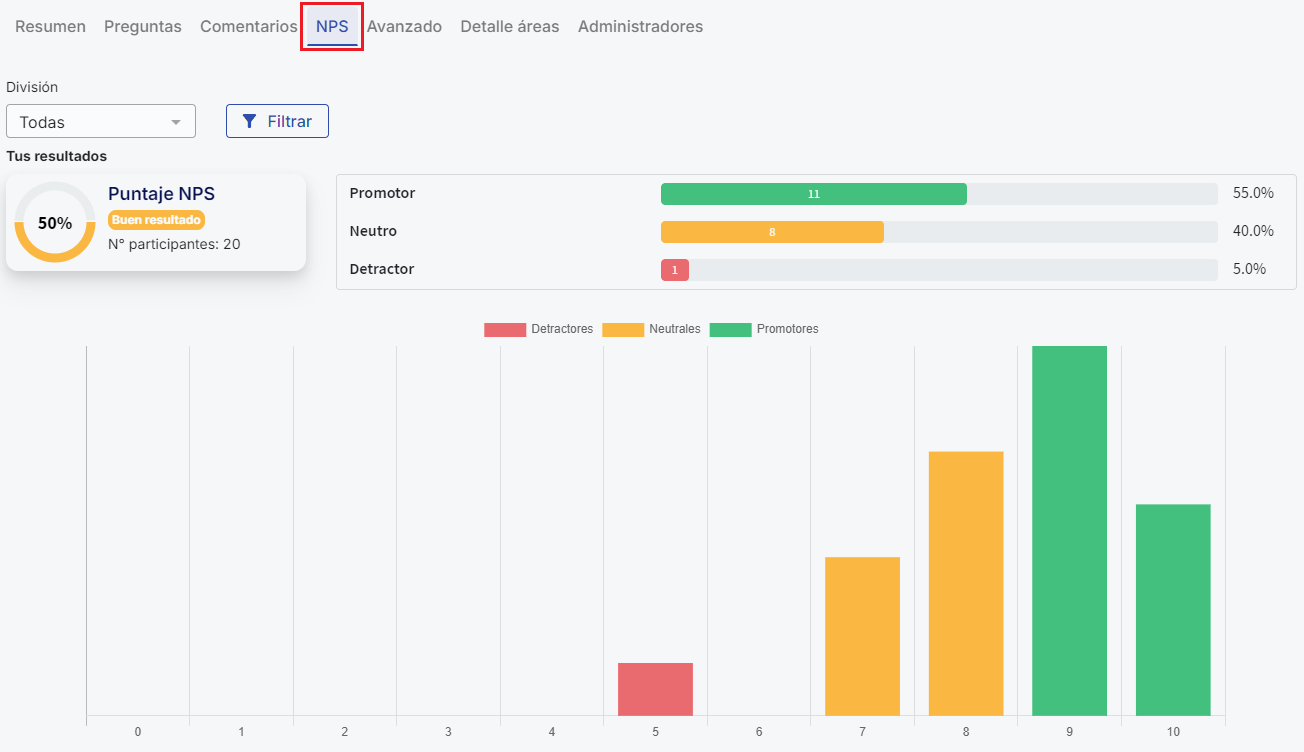 En la configuración de una encuesta puedes incorporar una pregunta tipo NPS de modo de evaluar el desempeño en alguna materia que necesites. En esta pestaña se mostrará los resultados de esta pregunta bajo la metodología NPS.