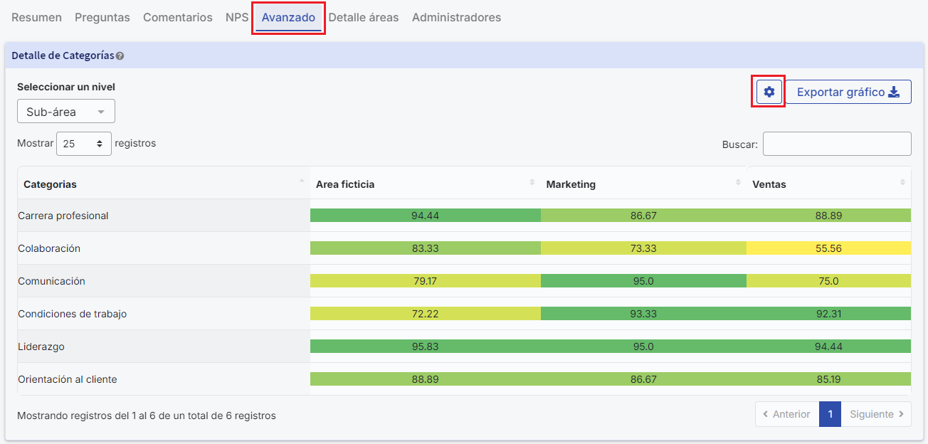 En la sección “Detalle de Categorías” podrás comparar los resultados de las categorías por nivel (Divisiones, áreas y subáreas). En el engranaje puedes editar la escala del heat map, eligiendo los colores de los rangos