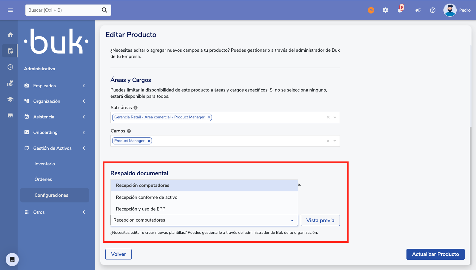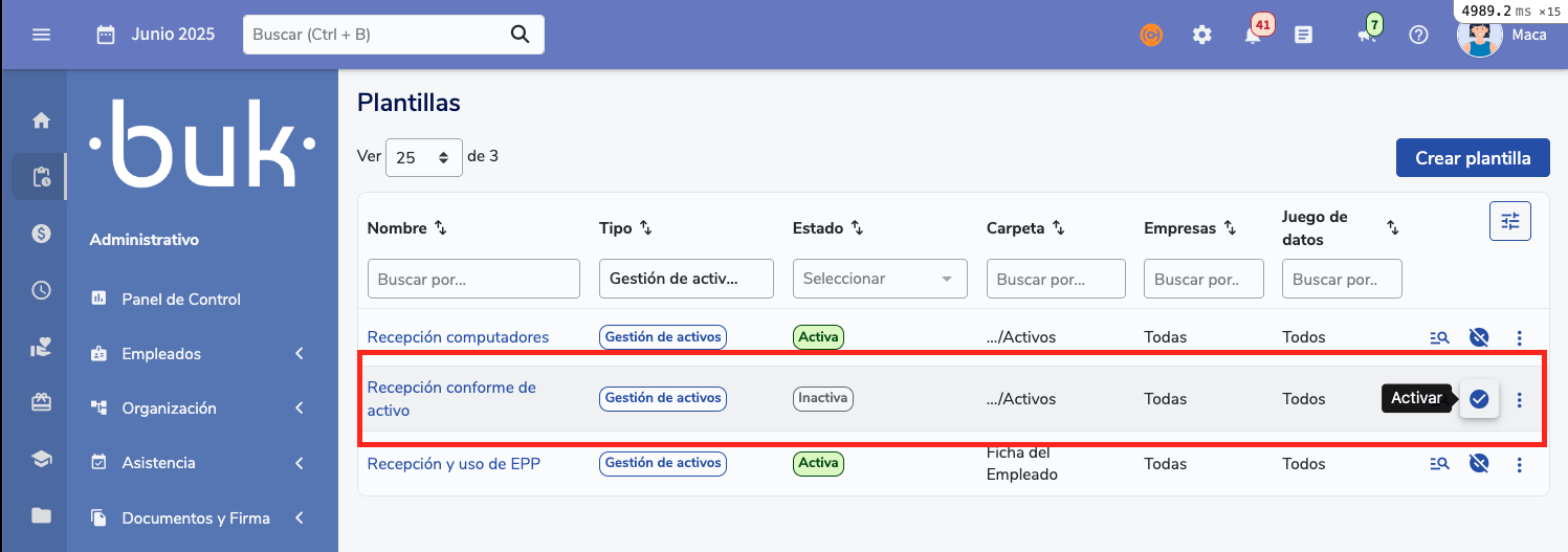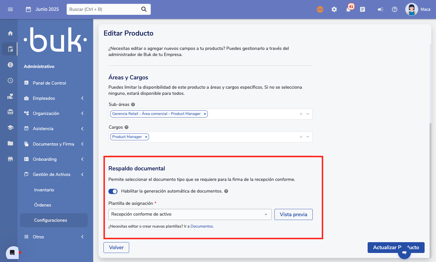 La integración entre Gestión de Activos y Gestión Documental en Buk permite automatizar la generación de documentos (Recepción conforme, cláusulas de uso) al asignar un activo a un colaborador. Esta guía explica cómo configurarlo, tanto para clientes sin Gestión Documental como para quienes ya la usan.