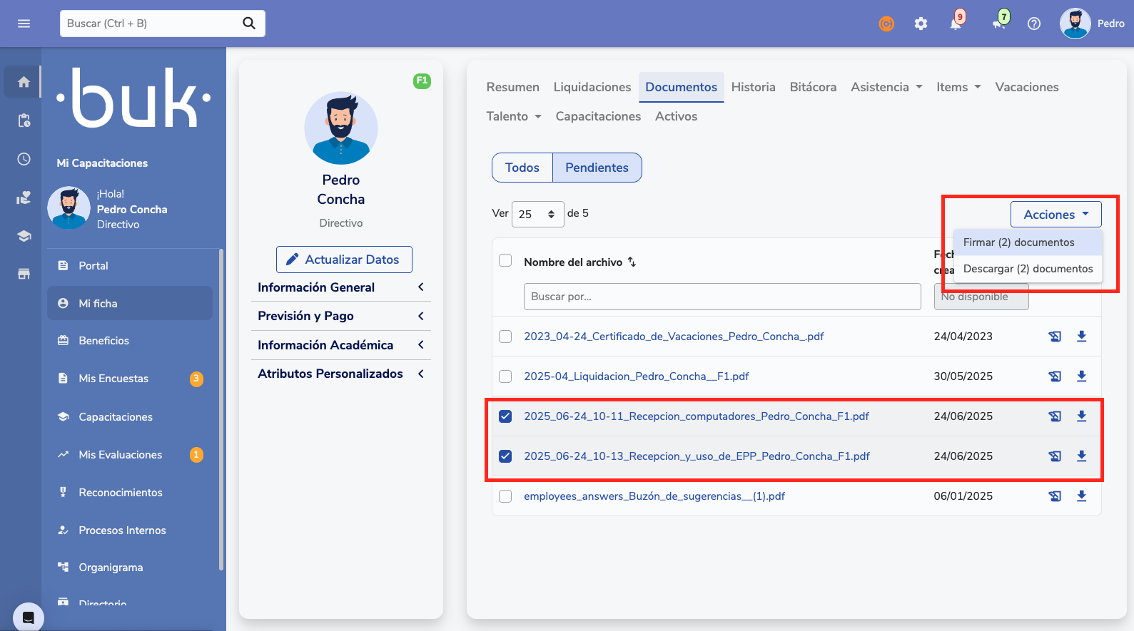 - Paso 3: El colaborador puede acceder a él en su ficha (Documentos > Carpeta "Activos") y firmar de manera individual o masiva.