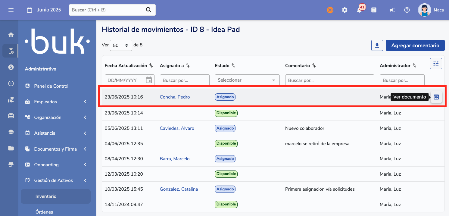 - Paso 4: El administrador de Gestión de Activos podrá ver el documento generado desde el Historial de movimientos de cada activo.