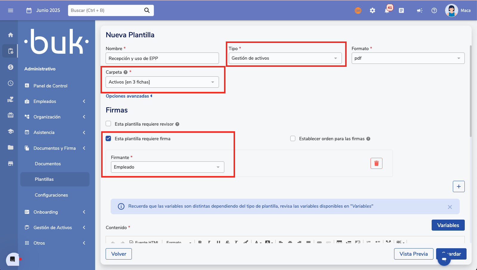 - Elige el tipo "Gestión de Activos" y diseña el documento (texto, campos variables, firmas).
