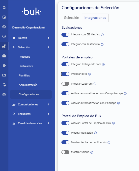 Aunque el portal ya está habilitado para tu empresa, ciertos datos clave de las vacantes vienen desactivados de forma predeterminada. Para que los postulantes puedan ver detalles como la ubicación o el salario, debes ajustar las configuraciones desde el módulo de selección.