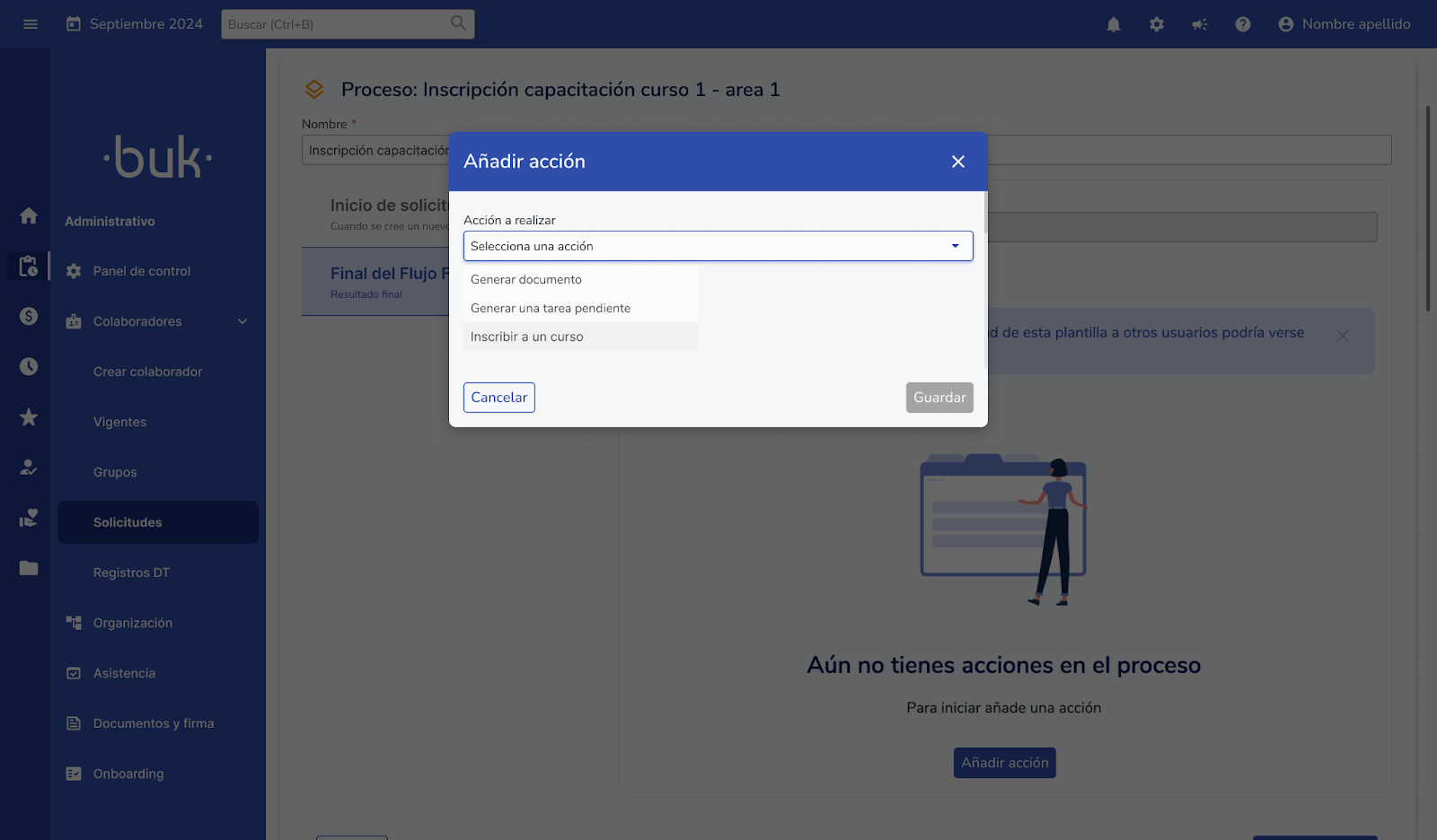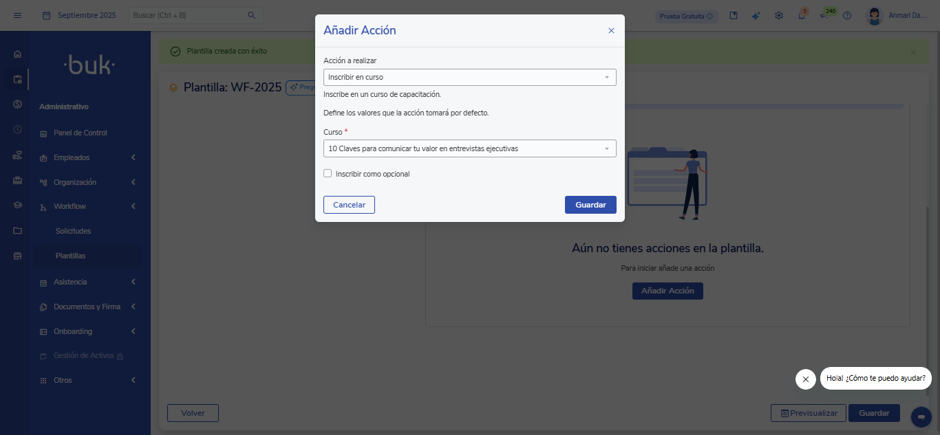 Esta funcionalidad permite que los usuarios con permisos de Capacitaciones puedan automatizar la inscripción de colaboradores a cursos del LMS directamente desde Workflows, conectando ambos módulos para optimizar procesos y reducir tareas manuales.