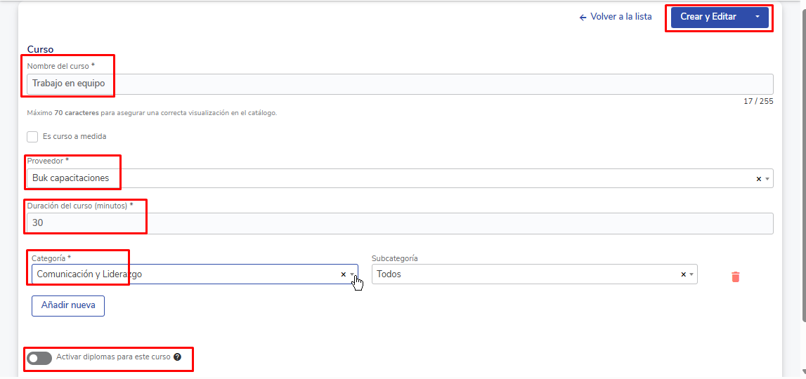 - Nombre del curso: utiliza un título claro y fácil de identificar.
