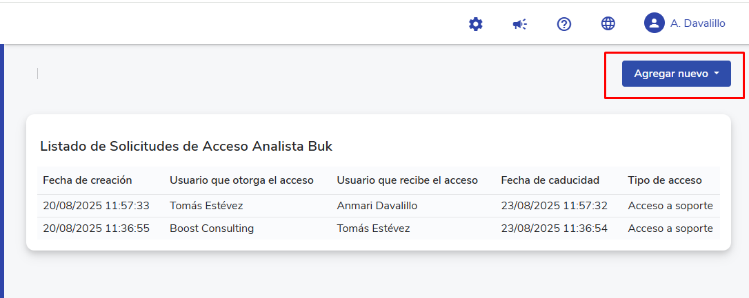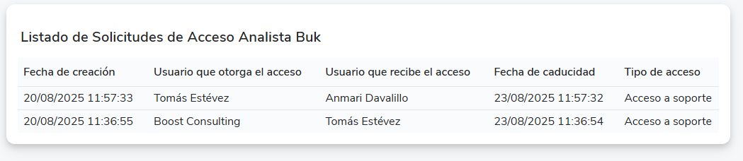 - Puedes ver el listado de las Solicitudes de Acceso Analista Buk al cual haz otorgado acceso: