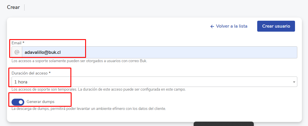 - Generar dumps: Debes activar esta opción cuando te lo sugiera tu Agente Buk para el acceso a la base de datos de ser necesario.