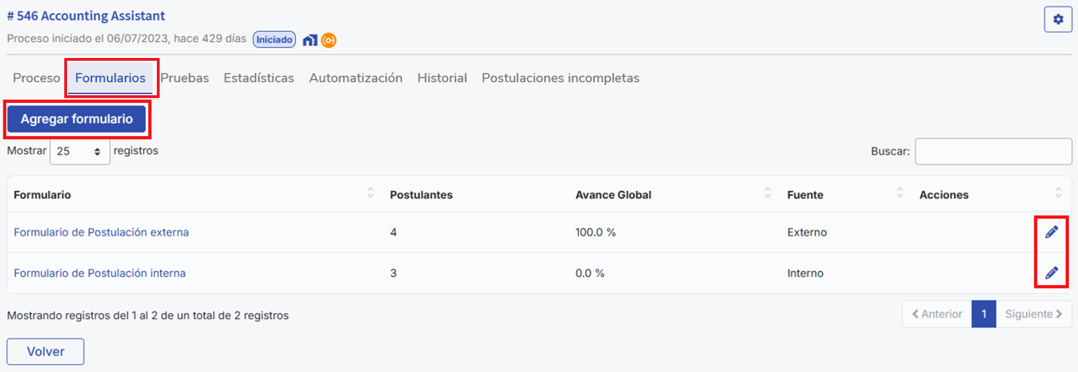 Esta pestaña muestra los formularios asociados al proceso. Se pueden editar con el botón de lápiz o agregar nuevos formularios con “Agregar formulario”, ya sea creando uno desde cero o utilizando uno previamente diseñado.