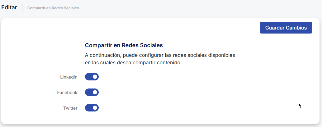 Compartir en RRSS: Integración que permite activar o desactivar las diferentes RRSS para poder compartir los logros de los usuarios colaboradores al finalizar los cursos aprobados.
