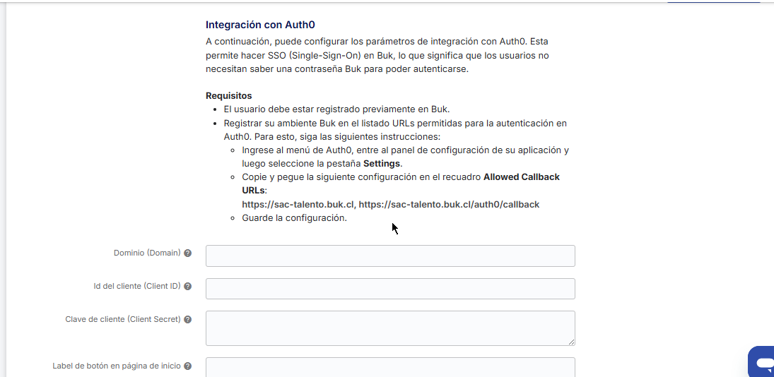 Al editar la integración, deberás completar los siguientes datos: Dominio (referente al dominio de autenticación, por ejemplo: boost.autho.com), ID del cliente (cliente Auth0), clave del cliente y label de botón en página de inicio ( referente a al texto del botón mostrado en la página de inicio).