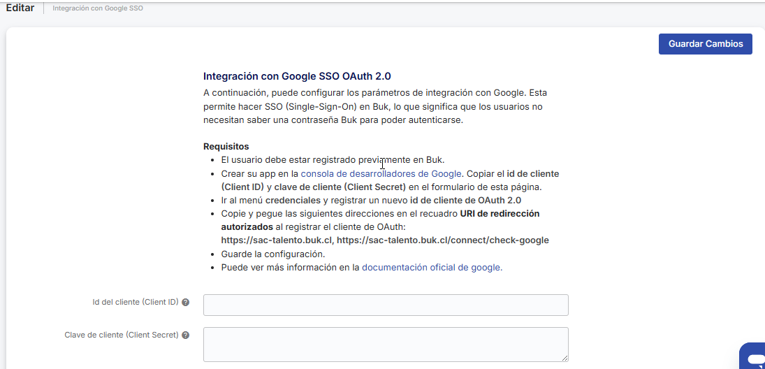 Al editar la integración, deberás completar la información del ID y la clave del cliente.