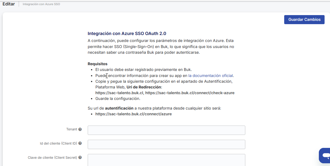 Al editar la integración, deberás completar la información del Tenant, ID y clave del cliente.