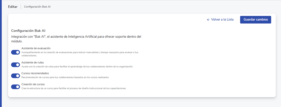 Buk AI: Esta integración permite activar un asistente virtual que utiliza Inteligencia Artificial dentro del LMS. Una vez habilitado, deberás hacer clic en "Editar" para activar específicamente la sección del LMS en la que requieras la asistencia de Buk AI.