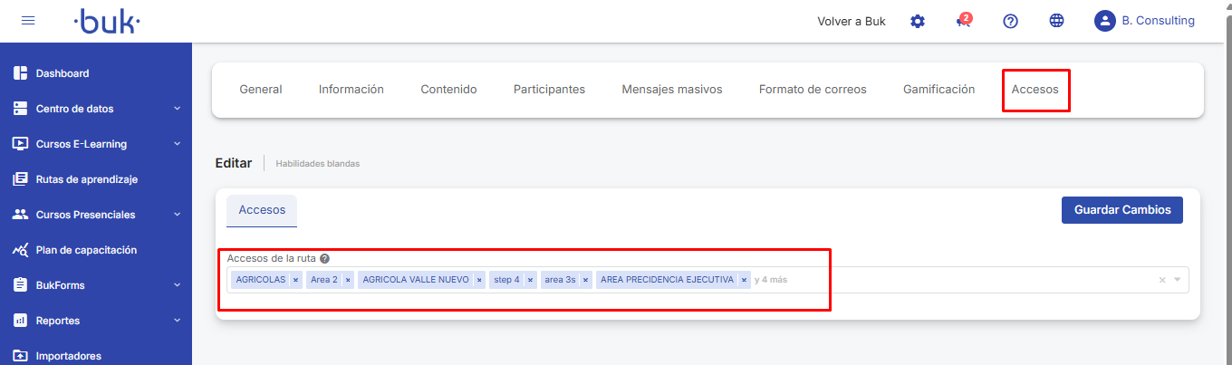 - Rutas de aprendizaje: Asigna permisos para configurar y visualizar rutas de aprendizaje.