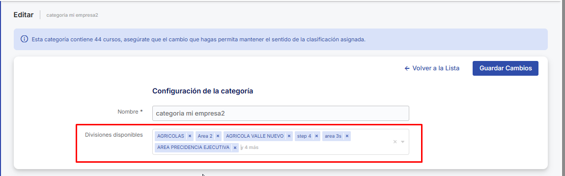 - Cursos e-learning: Define qué divisiones pueden configurar y visualizar cursos.