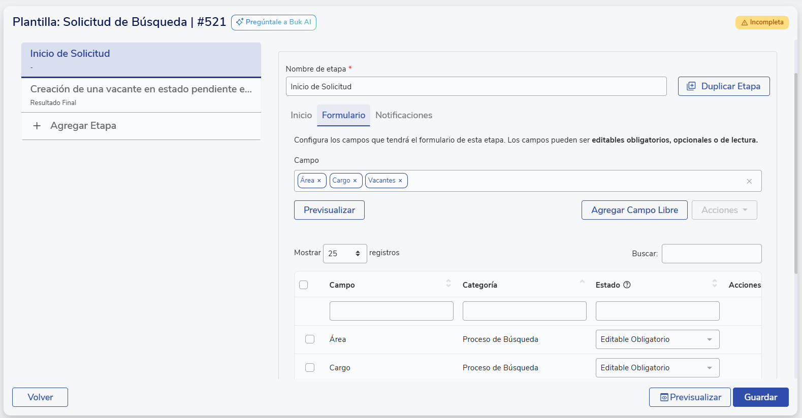 Para agregar este campo, debes ir a Workflow > Plantillas, y hacer clic en Crear Plantilla. Dentro de las plantillas, en la sección de Selección escoger "Solicitud de Búsqueda".