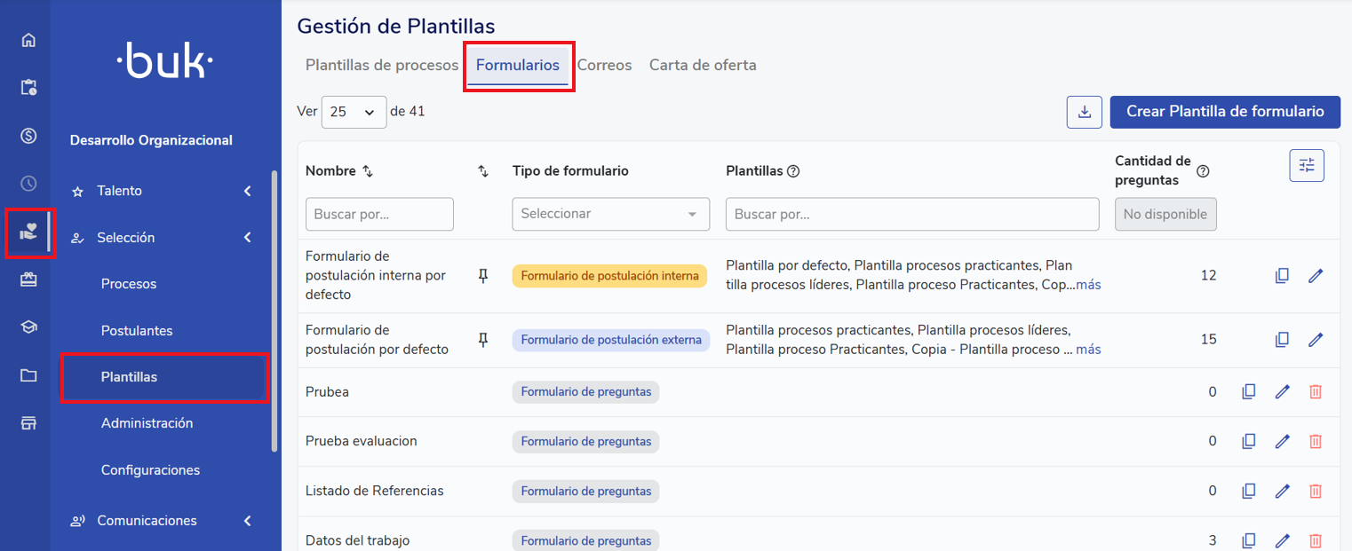 Para crear plantillas de formularios para postulación interna, ingresa a "Desarrollo Organizacional" en el menú lateral y selecciona "Selección", después en la sección "Plantillas". Luego, en "Formularios", haz clic en "Crear formulario".