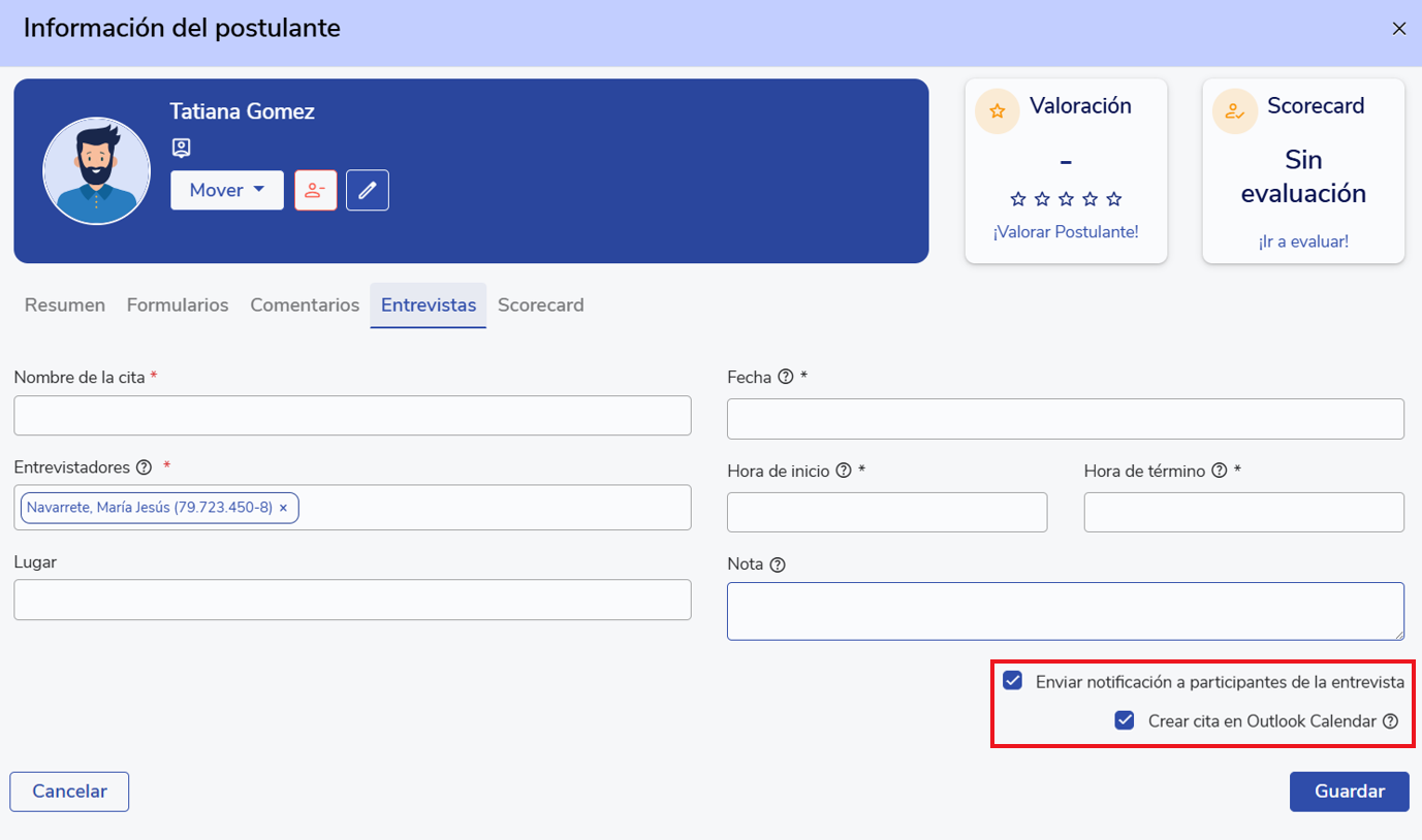 Asegúrate de seleccionar la opción "Crear cita en Outlook Calendar" para que la cita se envíe automáticamente a los calendarios del postulante y de los entrevistadores seleccionados.