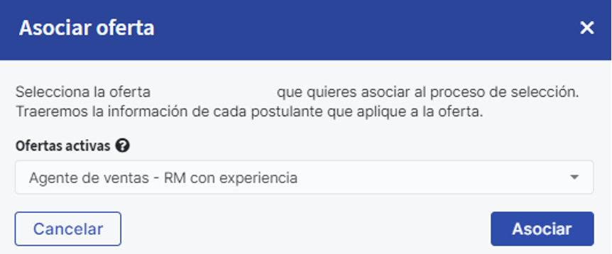 Después, tendrás que seleccionar la oferta de trabajo que deseas asociar al proceso de selección. En el listado, encontrarás las ofertas que estén activas en el Portal de Empleo.