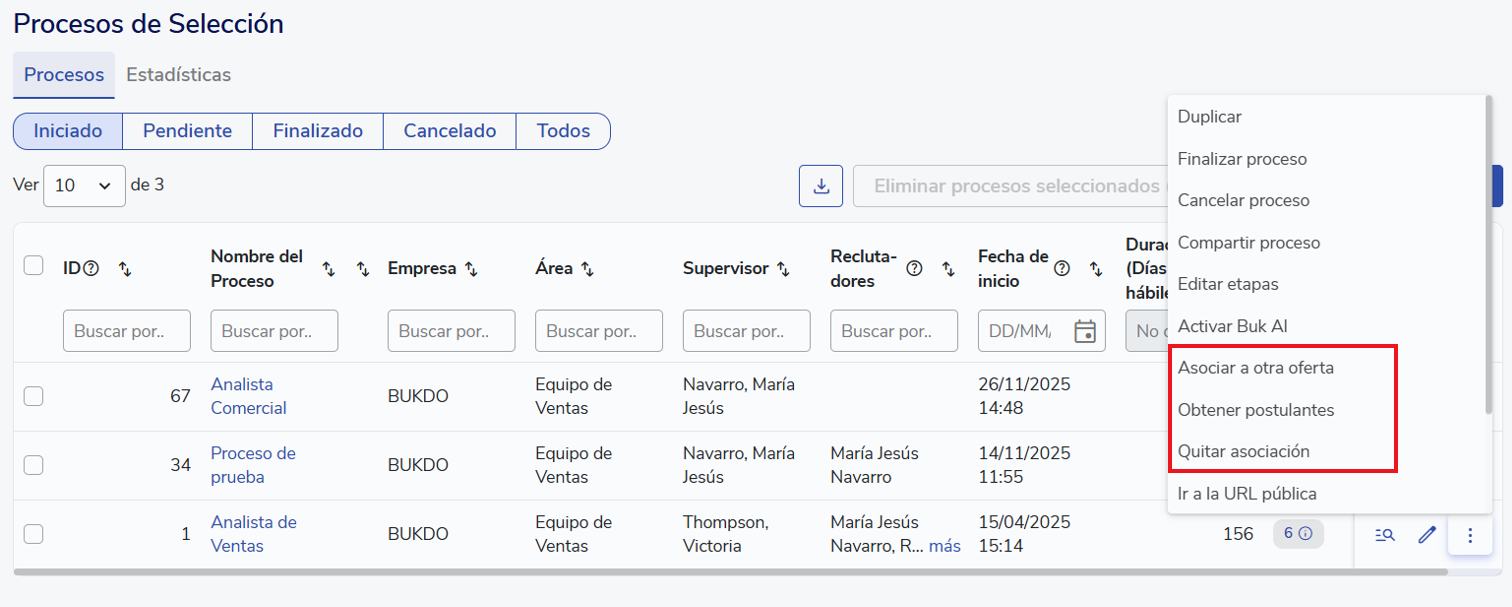 Haciendo clic en "Asociar" ya tendrás tu oferta del Portal de Empleo asociada al proceso de selección en Buk. Una vez que hayas asociado la oferta, puedes modificarla desde "Más opciones", accediendo a "Asociar a otra oferta de Portal de Empleo".