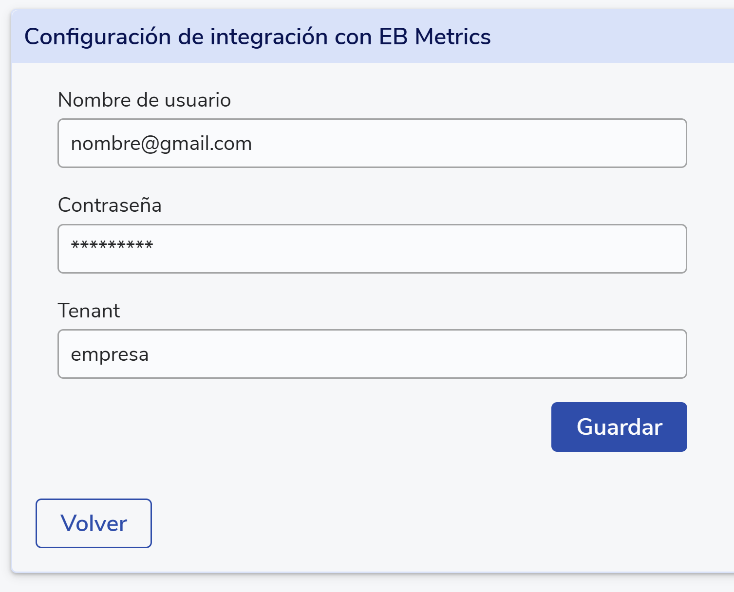 - Nombre de usuario: El correo electrónico o alias usado para ingresar a la plataforma de EB Metrics.