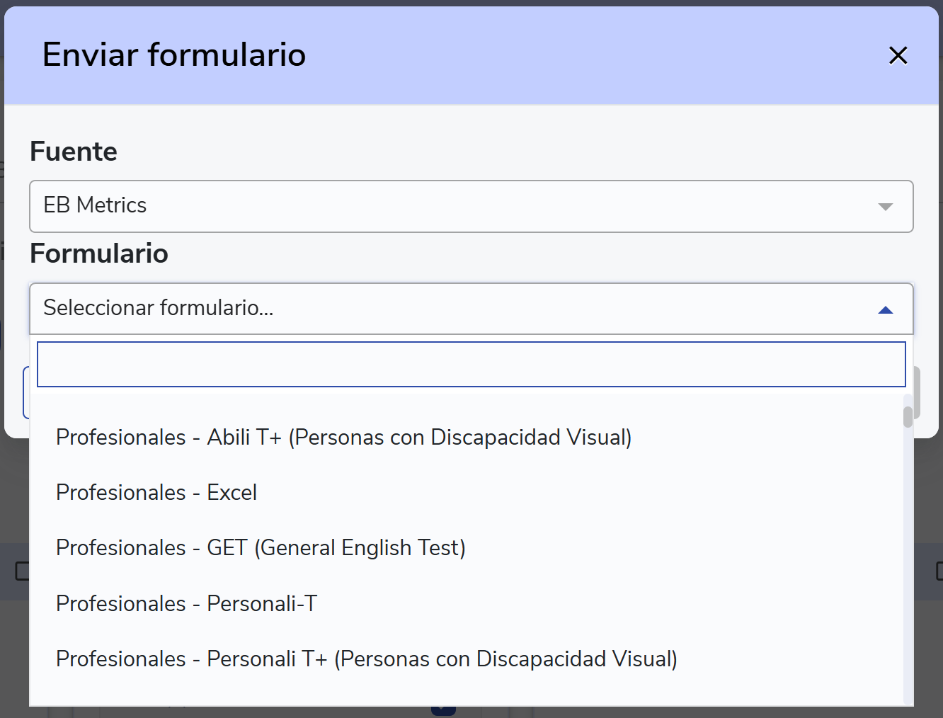 Se abrirá una ventana donde deberás seleccionar como fuente “EB Metrics” y luego elegir la prueba a aplicar. Al hacer clic en “Aceptar”, se enviará automáticamente un correo al o los postulantes con la prueba psicométrica correspondiente.