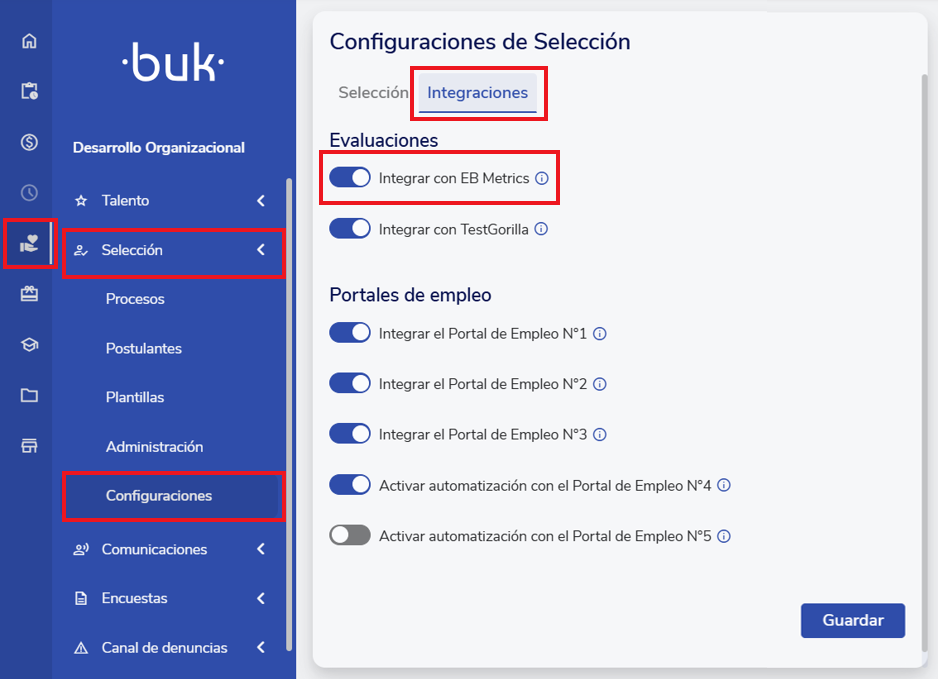 Para activar EB Metrics en Buk se debe ingresar al módulo de Selección, luego a la sección de "Configuraciones" y a la pestaña de "integraciones". Acá debes activar el switch correspondiente y dar clic en “Guardar”.