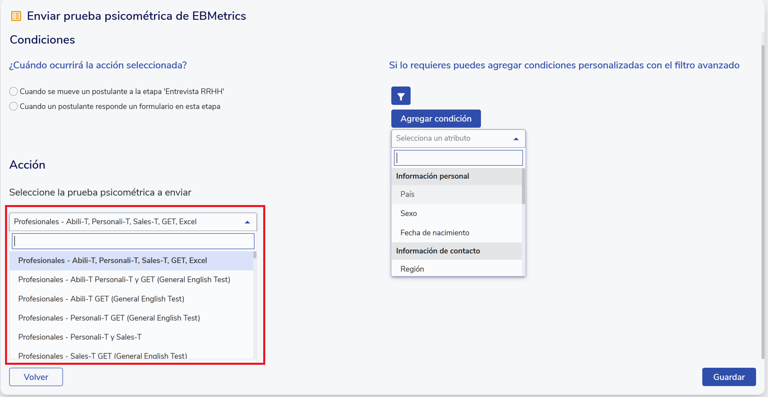 Entre las opciones disponibles, selecciona “Enviar prueba psicométrica de EB Metrics”. Esto abrirá una nueva ventana donde se debe definir el momento en que se enviará la prueba (ya sea cuando el postulante sea movido a la etapa o cuando responda un formulario). Luego, elegir la prueba específica que se desea aplicar desde el catálogo disponible. Por último, configurar las condiciones adicionales que se requieran. Una vez definidos todos los parámetros, haz clic en “Guardar” para activar la regla de automatización.