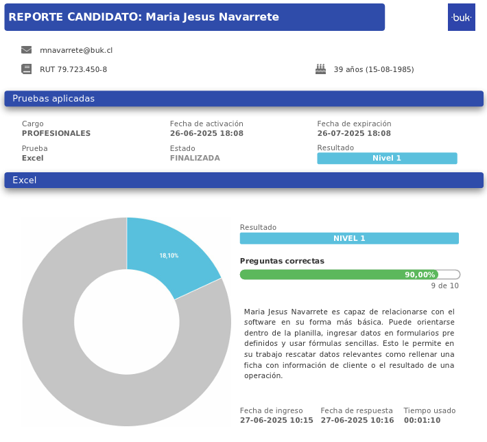 Los resultados de las pruebas se pueden revisar individualmente por cada candidato, descargando un archivo PDF que detalla el puntaje o nivel obtenido. Este informe incluye los datos personales del postulante, la descripción de la prueba y el análisis de sus resultados.