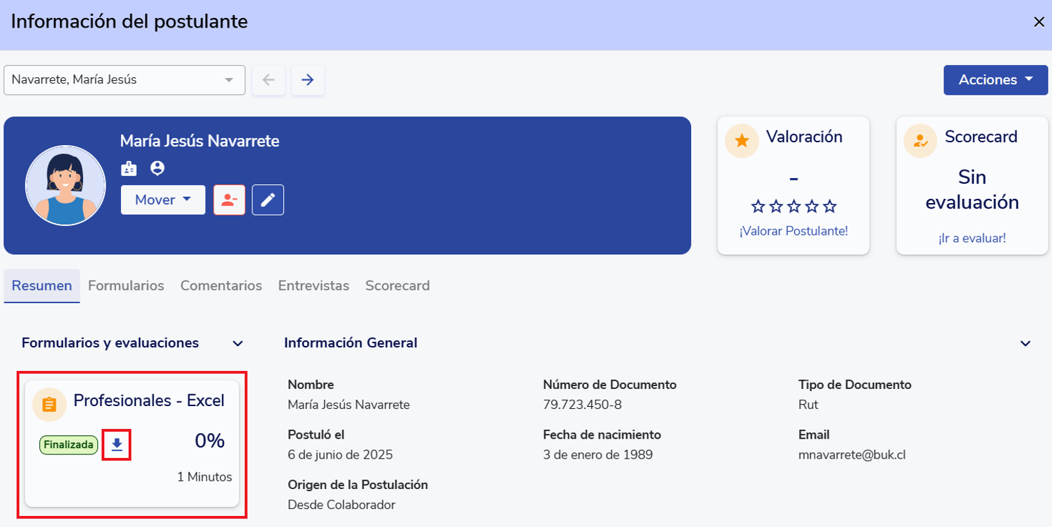 Otra alternativa es acceder directamente a la ficha de un postulante desde la pestaña “Proceso”. En la parte izquierda, se listan los formularios enviados, su estado, el porcentaje de aprobación (si aplica) y un ícono de flecha para descargar el informe correspondiente.