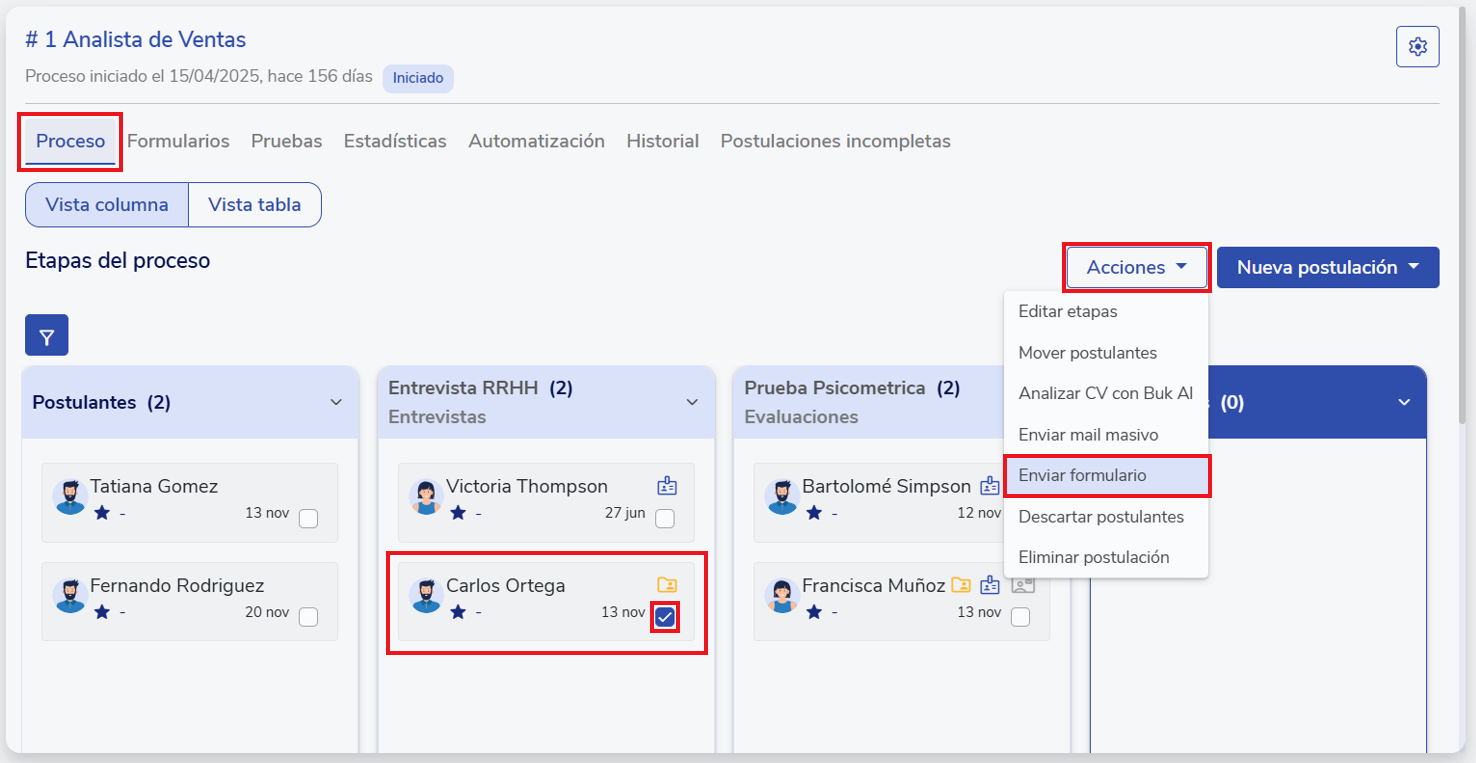 Para enviar una prueba a uno o varios candidatos de forma manual, ingresa al proceso de selección, selecciona los postulantes deseados y haz clic en Acciones > Enviar formulario.