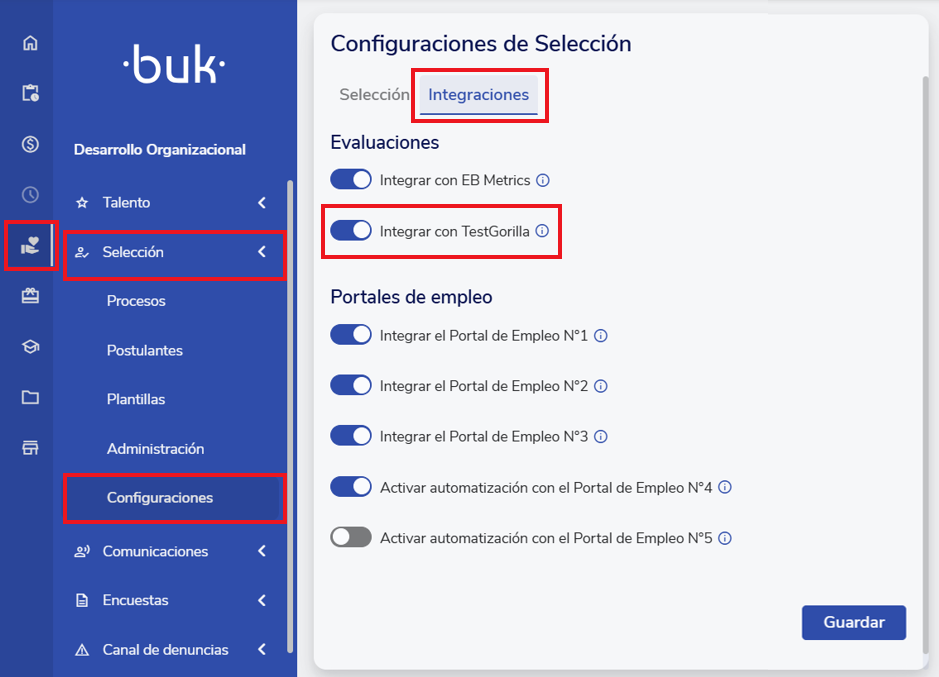Para activar TestGorilla en Buk se debe ingresar al módulo de Selección, luego a la sección de "Configuraciones" y a la pestaña de "integraciones". Acá debes activar el switch correspondiente y dar clic en “Guardar”.