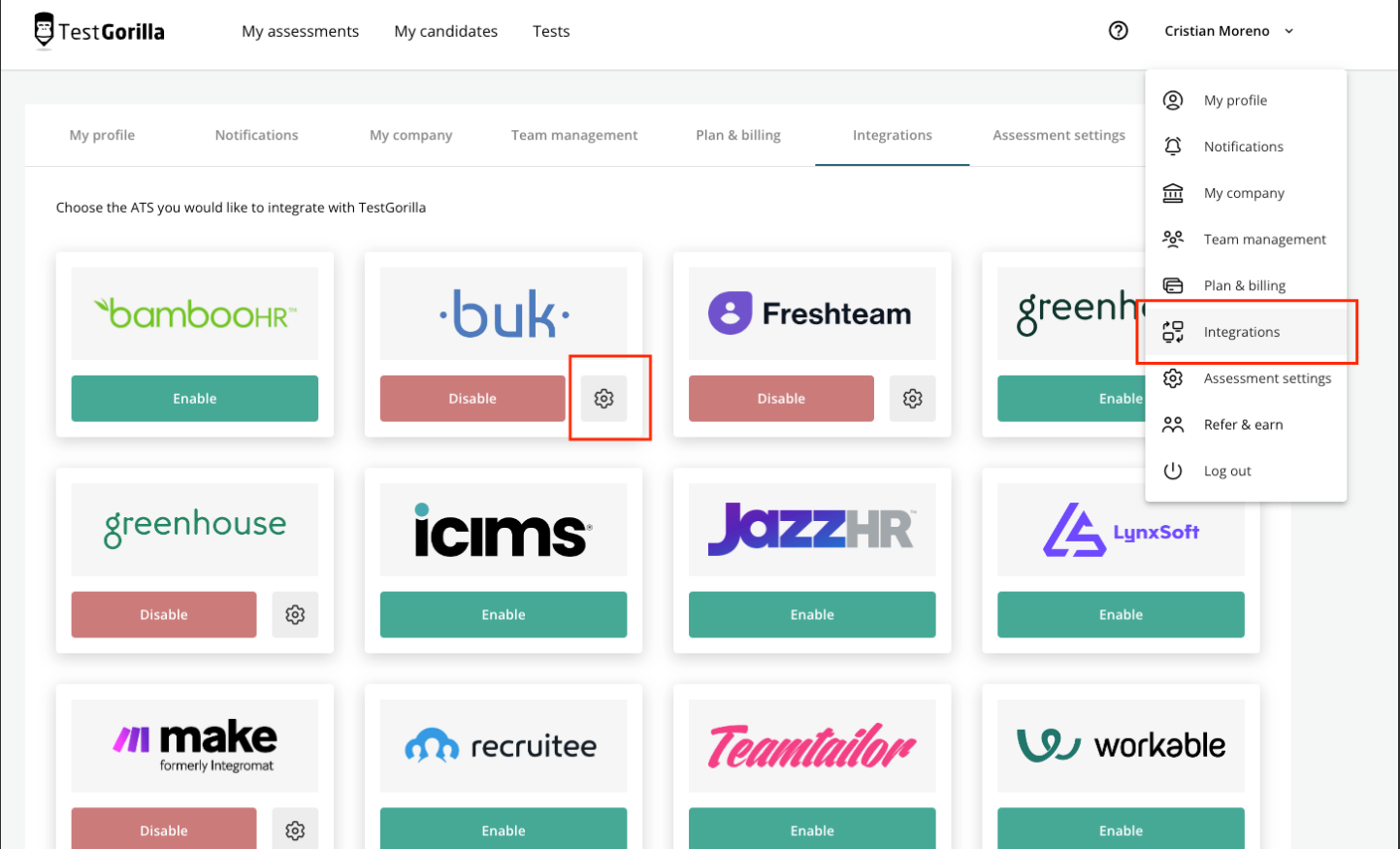 Para obtener la API Key, el usuario debe ingresar a la página de TestGorilla a la sección de Integrations. Dentro de esta sección, ubicar el logo de Buk, presionar el botón Enable y luego en la tuerca para acceder a la API Key generada automáticamente.