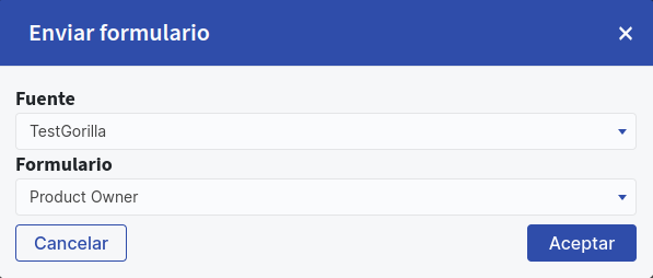 Se abrirá una ventana donde deberás seleccionar como fuente “TestGorilla” y luego elegir la prueba a aplicar. Al hacer clic en “Aceptar”, se enviará automáticamente un correo al o los postulantes con la prueba psicométrica correspondiente.