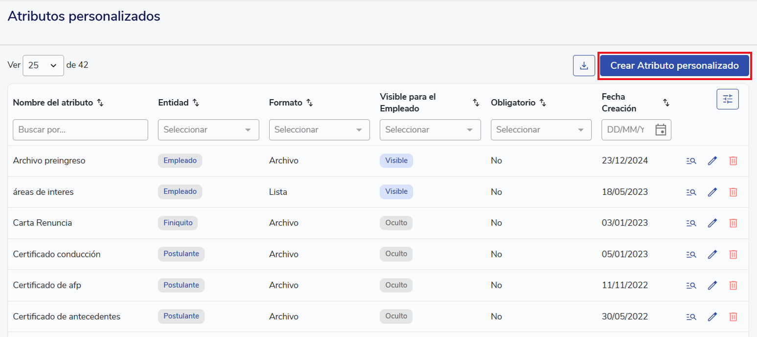 Lo primero es crear un atributo personalizado, el cual debe estar vinculado a la entidad Postulante. Para esto se debe ir a la Configuraciones ⚙️ en la parte superior derecha y luego a "Atributos Personalizados".