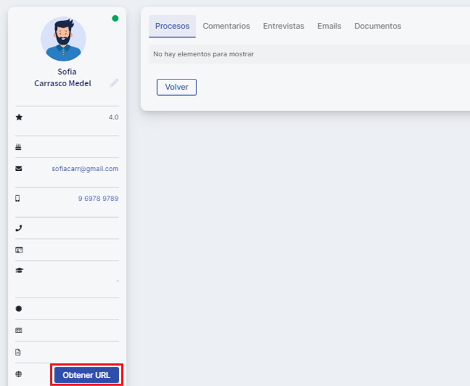 Por último, para verificar puedes ingresar a la ficha del postulante, copiar la URL (hacer clic en la URL para que sea visible, seleccionar y colocar Ctrl+C) y pegarla en la barra de direcciones para revisar que los campos hayan quedado bien configurados: