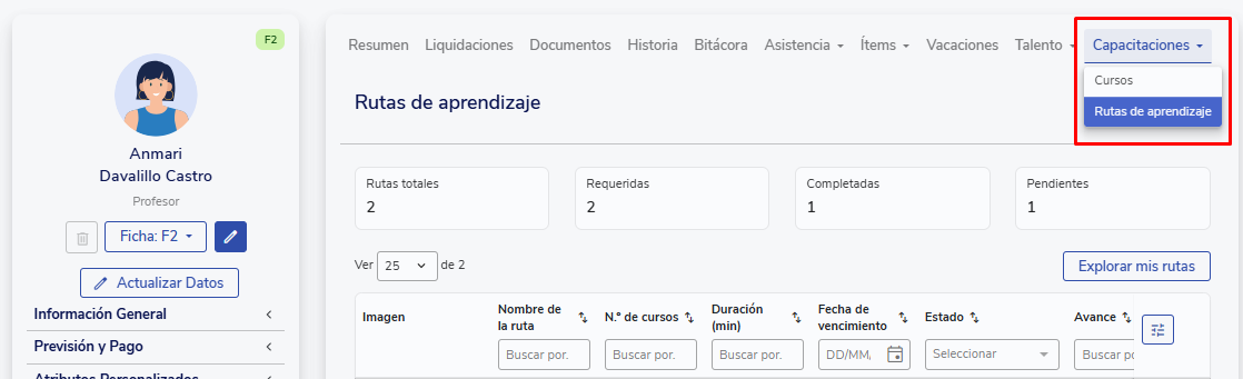 Además, para cada ruta podrás revisar: - Nombre de la ruta. - Número de cursos asociados. - Duración total. - Fecha de vencimiento, si aplica. - Estado de la ruta. - Porcentaje de avance.