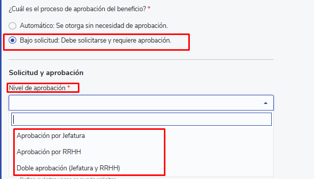 Si lo que necesitas es que el beneficio sea solicitado por los colaboradores debes seleccionar "Bajo solicitud" e indicar el nivel Nivel de Aprobación.