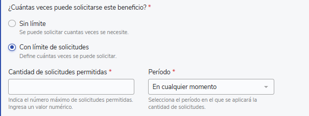 Puedes limitar la cantidad de veces que un colaborador pueda solicitar un beneficio en la opción ¿Cuántas veces puede solicitarse este beneficio?*